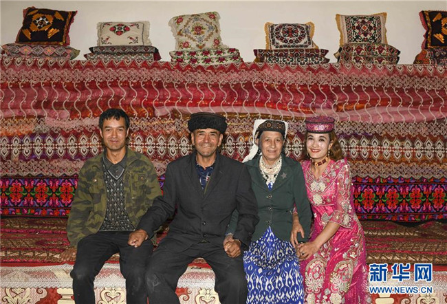 這是大同鄉(xiāng)阿依克日克村二小隊(duì)村民瑪達(dá)孜孜·由力達(dá)西(左二)一家在安居房?jī)?nèi)的合影(6月17日攝)。新華社記者胡虎虎攝