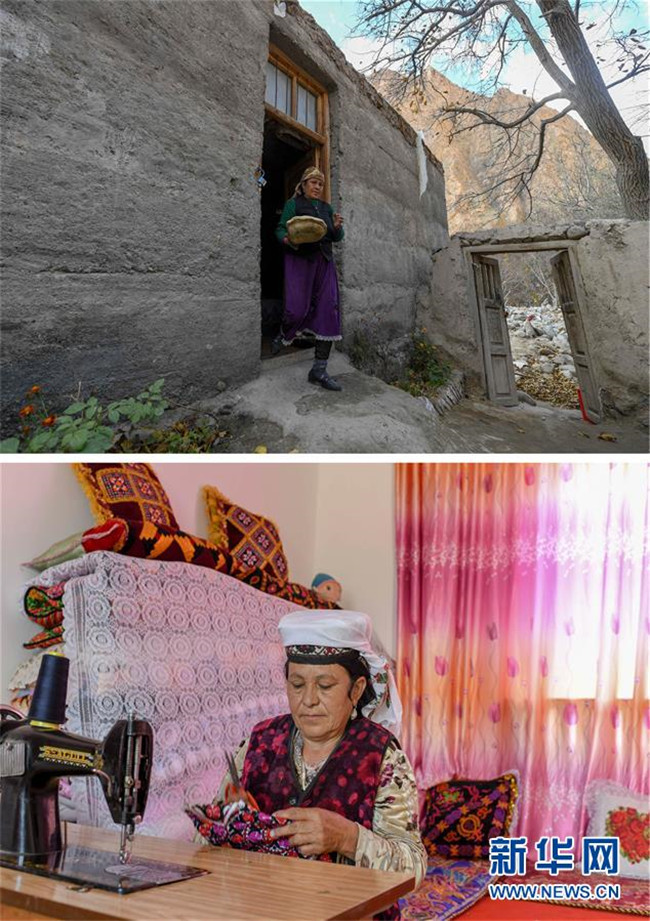拼版照片:上圖為大同鄉(xiāng)庫(kù)如克欄桿村村民海熱尼莎·薩木薩克拿著馕走出老房子(2018年11月11日攝);下圖為在新疆塔什庫(kù)爾干塔吉克自治縣塔提庫(kù)力易地扶貧搬遷安置點(diǎn)新居內(nèi),海熱尼莎在做針線活(2019年6月26日攝)。新華社記者胡虎虎攝