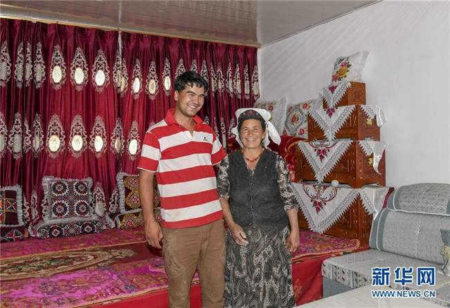 這是在新疆塔什庫(kù)爾干塔吉克自治縣大同鄉(xiāng)的一處易地扶貧搬遷安置點(diǎn)安居房?jī)?nèi)拍攝的古力西爾汗·阿迪那買買提與母親的合影(6月18日攝)。他家已于2018年脫貧。新華社記者胡虎虎攝