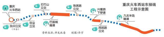 重慶日報記者7月2日獲悉,市發(fā)展改革委近日正式批復了重慶火車西站東接線工程可行性研究報告。項目全長9.4公里,呈東西走向,總投資約74.9億元,建成后將緩解重慶西站對外的交通壓力。