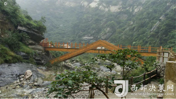 踏進峪口,頭頂是遮天蔽日的綠色,四周水聲潺潺,鳥鳴悅耳,空谷幽靈,沉靜自然,涼爽的山風夾雜著花草的芳香,瞬間就滋潤了燥熱的心情。迎著溪谷逆水而上,山的奇特與水的靈秀交織在一起,伴著水聲,綿延著向更遠處伸展。若有情致,卷起褲腿,或穿上沙灘鞋,或赤足,踏著被溪水長久沖刷平整光滑的大石頭,任由清涼通透的溪水撫摸雙足,沁心入骨,仿佛拾回了童年的歡樂,煩擾憂愁全無蹤影。臨水而筑的棧道,全程依水而行,曲徑通幽,每轉一道彎,都是一幅新景。