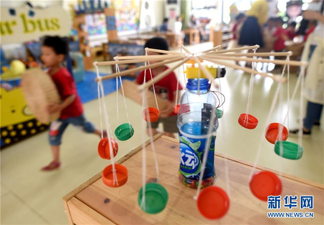 這是7月4日拍攝的德清縣乾元鎮(zhèn)第一幼兒園小朋友們通過廢物回收制作的手工藝品。新華社記者 韓傳號(hào) 攝