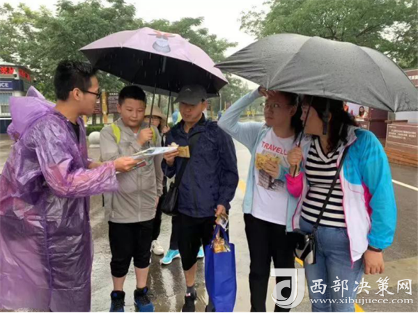志愿者向游客宣傳環(huán)保小知識(shí)并送上景區(qū)宣傳彩頁