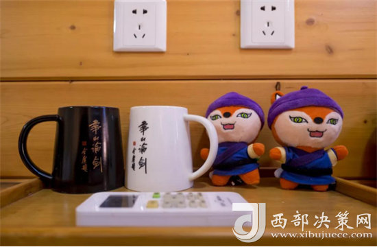 華山文創(chuàng)馬克杯、和“華山吾俠”毛絨公仔點綴在桌上,簡單明快的這一小片區(qū)域都像是在敘述華山論劍的故事。