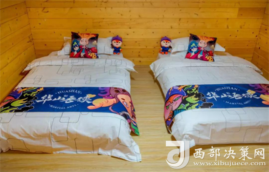 再往里邊走就是大朋友(成人)的休息場所,同樣以華山故事為主題布置的床,干凈整潔,元素主題鮮明,床上還為大朋友(成人)準備了“華山吾俠”系列U型枕,自駕來的朋友可以帶上它,來緩解因久坐開車帶來的頸椎酸痛。