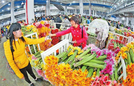 云花是云南省一張亮麗的名片。2018年,云花總產(chǎn)值達(dá)到525.9億元,40多萬從業(yè)者參與到這份美好的事業(yè)中,成為脫貧致富和全面建成小康社會的重要產(chǎn)業(yè)力量。圖為斗南花市上忙碌的賣花人。(記者黃喆春攝)