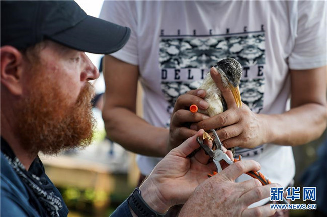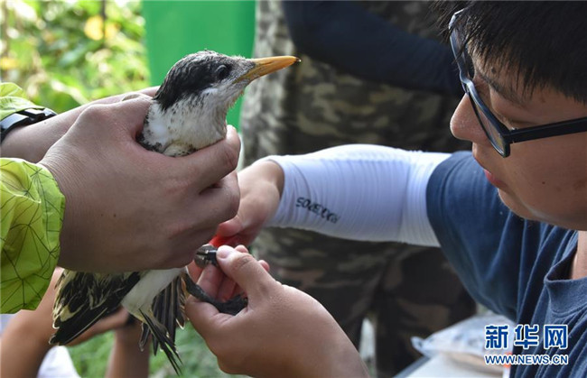 7月25日,美國鳥類保護(hù)專家在浙江韭山列島國家級(jí)自然保護(hù)區(qū)為一只鳳頭燕鷗幼鳥戴上標(biāo)志。新華社記者 殷曉圣 攝