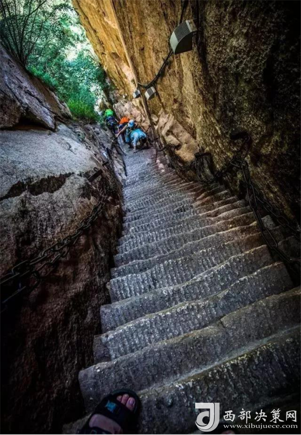 下去的路鑿在倒坎懸崖上,幾乎看不見路,需要用腳去試探,攀爬的困難程度甚至比長(zhǎng)空棧道更難,當(dāng)然可以看到的風(fēng)景也非常的獨(dú)到。