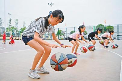8月5日,南充小學生在操場上練習運球。 本報記者 楊樹 攝