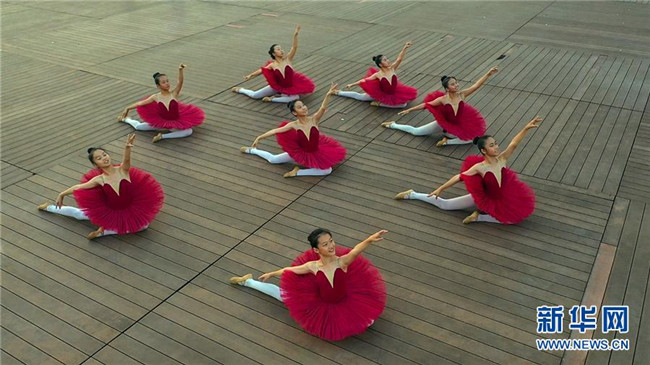 8月9日,芭蕾小天使們?cè)跉J州市夢(mèng)圓廣場(chǎng)排練節(jié)目。新華社記者 張愛林 攝