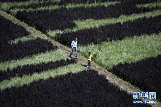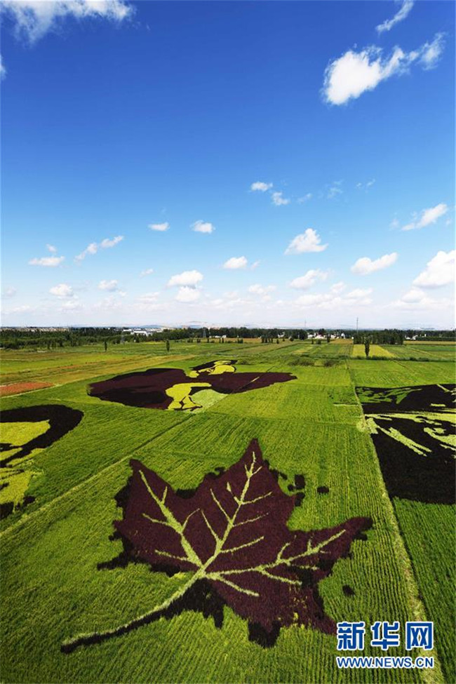 這是8月18日在新疆察布查爾錫伯自治縣納達(dá)齊牛錄鄉(xiāng)稻田畫基地拍攝的稻田畫。