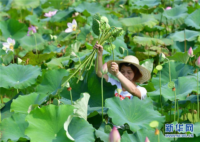 村民在廣西鹿寨縣中渡鎮(zhèn)大兆村采蓮蓬(8月23日攝)。 新華社記者 黃孝邦 攝
