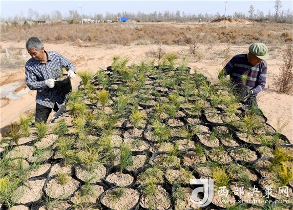 靖邊縣東坑鎮(zhèn)毛團(tuán)村的村民在栽種樟子松樹苗