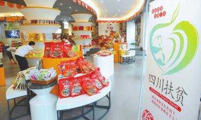 在四川特產(chǎn)購物中心內(nèi)售賣的貼有“四川扶貧”公益性集體商標(biāo)的產(chǎn)品。四川日報記者何海洋攝