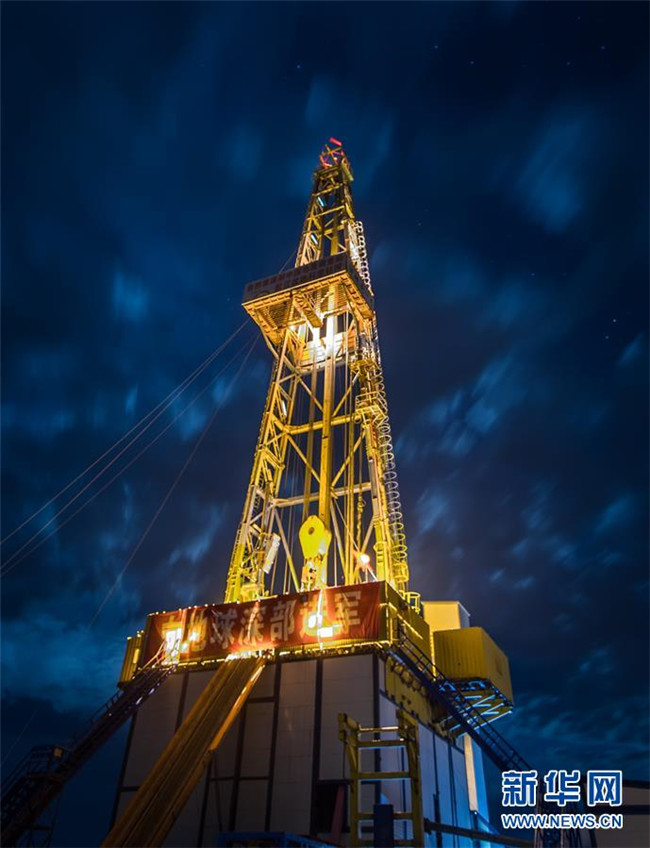夜幕下的“地殼一號(hào)”萬米鉆機(jī)整機(jī)系統(tǒng)(2018年6月1日攝)。2018年6月2日,吉林大學(xué)主要承擔(dān)研發(fā)的“地殼一號(hào)”萬米鉆機(jī)正式宣布完成“首秀”:完鉆井深7018米,創(chuàng)造了亞洲國家大陸科學(xué)鉆井新紀(jì)錄,標(biāo)志著我國成為繼俄羅斯和德國之后,世界上第三個(gè)擁有實(shí)施萬米大陸鉆探計(jì)劃專用裝備和相關(guān)技術(shù)的國家。 新華社記者 許暢 攝