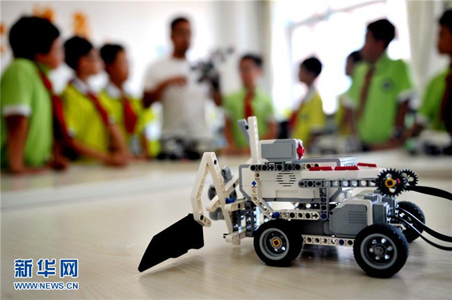 9月5日,在承德市雙橋區(qū)東園林小學(xué),學(xué)生在老師的指導(dǎo)下學(xué)習(xí)機(jī)器人知識(shí)。