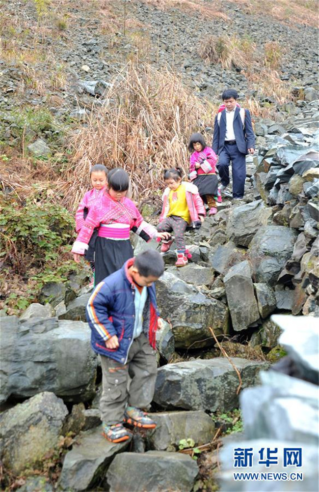 在廣西龍勝各族自治縣龍脊鎮(zhèn)江柳村,翁江教學(xué)點老師余啟貴和學(xué)生一起走在去學(xué)校的路上(2013年2月26日攝)。新華社記者 陸波岸 攝
