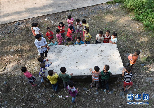 在廣西東蘭縣三石鎮(zhèn)泗爺小學(xué),黃英雄老師在照顧學(xué)生睡午覺(2014年9月10日攝)。新華社記者 陸波岸 攝