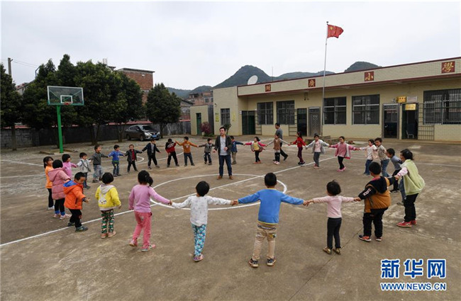 在廣西富川瑤族自治縣湖廣小學(xué),學(xué)校師生課間一起做游戲(3月20日攝)。湖廣小學(xué)是一所位于湘桂邊界的學(xué)校,學(xué)生一部分來自湖南,一部分來自廣西。兩名老師,一名來自湖南,一名來自廣西。新華社記者 陸波岸 攝