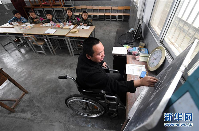 在廣西凌云縣下甲鎮(zhèn)河洲村念恩小學(xué),阮文憑老師坐在輪椅上給學(xué)生上課(3月26日攝)。新華社記者 陸波岸 攝