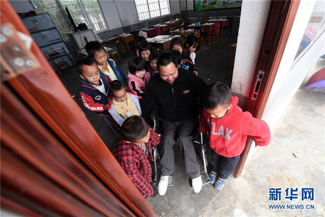 在廣西凌云縣下甲鎮(zhèn)河洲村念恩小學(xué),阮文憑老師下課后在學(xué)生幫助下坐著輪椅出教室(3月26日攝)。新華社記者 陸波岸 攝