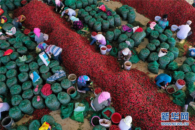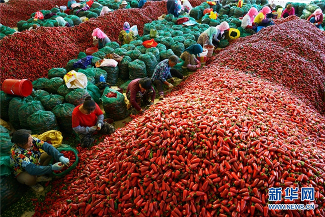 這是近日在甘肅省高臺縣拍攝的辣椒分揀、挑選場景。時(shí)下,高臺縣宣化鎮(zhèn)和駱駝城鎮(zhèn)種植的1700畝墨西哥辣椒進(jìn)入采摘和收購期,火紅的辣椒堆積如山,映紅了農(nóng)民的笑臉。新華網(wǎng)發(fā)(鄭耀德 攝)