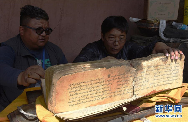 在西藏日喀則市定日縣倫措寺,西藏自治區(qū)古籍保護(hù)中心古籍專(zhuān)家在查看古籍文獻(xiàn)(資料照片)。新華社記者春拉攝