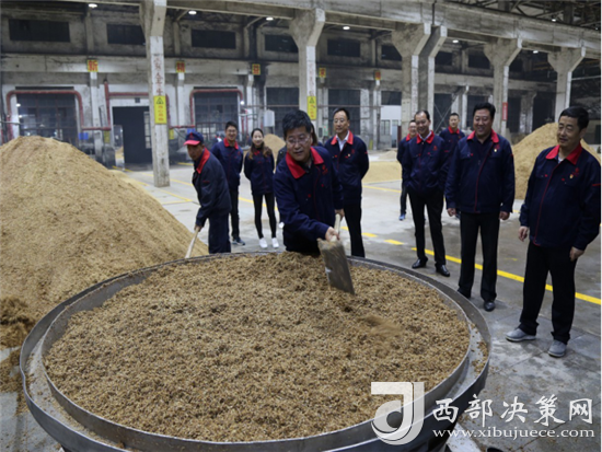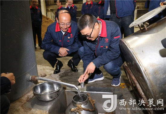 西鳳集團公司領(lǐng)導班子成員還詳細查看了窖池發(fā)酵情況,現(xiàn)場和工人師傅們一起裝甑餾酒,為大家鼓勁加油!