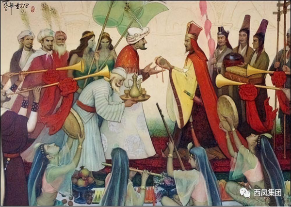 酒除了是國家祭祀必不可少的重要部分外,也在商業(yè)賦稅和人們情感交流中承擔(dān)著重要地位。陜西西安(古長安)是古絲綢之路的起點,鳳翔是古絲綢之路的重要驛站,西鳳酒自漢代以來就作為饋贈友邦、域外交流的國禮。史書記載,唐儀鳳(公元676年)年間的一個陽春三月,吏部侍郎裴行儉護送波斯王子泥涅師回國途中,行至鳳翔縣城以西的亭子頭村附近,發(fā)現(xiàn)柳林鎮(zhèn)窖藏陳酒香氣將五里地外亭子頭的蜜蜂蝴蝶醉倒的奇景,即興吟詩贊嘆曰:“送客亭子頭,蜂醉蝶不舞;三陽開國泰,美哉柳林酒”,并以此詩贈送王子。