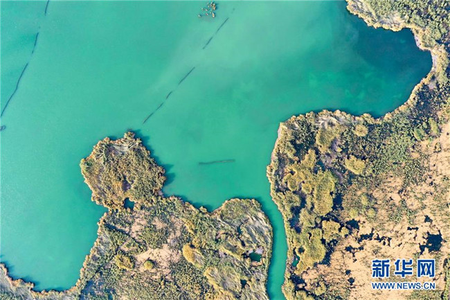 開(kāi)都河支流匯入博斯騰湖(10月12日無(wú)人機(jī)拍攝)。入秋以來(lái),新疆博斯騰湖碧波蕩漾,美景如畫,吸引各地游客前來(lái)游玩。新華社記者丁磊攝