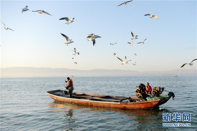 新疆博湖縣的漁民在博斯騰湖捕魚(yú)(10月12日攝)。入秋以來(lái),新疆博斯騰湖碧波蕩漾,美景如畫,吸引各地游客前來(lái)游玩。新華社記者丁磊攝