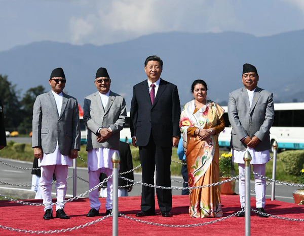 10月12日,國家主席習近平乘專機抵達加德滿都,開始對尼泊爾進行國事訪問。尼泊爾總統(tǒng)班達里在機場為習近平舉行具有濃郁尼泊爾民族特色的歡迎儀式。新華社記者高潔攝