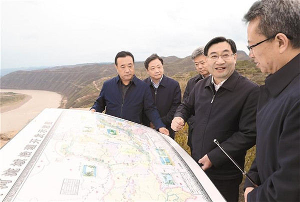 十月二十四日,省委書記胡和平來到位于宜川縣云巖鎮(zhèn)的黃河古賢水利樞紐工程現(xiàn)場,聽取項(xiàng)目規(guī)劃介紹。 本報(bào)記者 宋紅梅攝