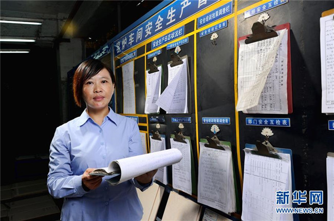 首批農(nóng)民工全國人大代表之一胡小燕在曾經(jīng)工作過的陶瓷廠檢查職工權(quán)益保護工作(2013年11月5日攝)。新華社記者 劉大偉 攝