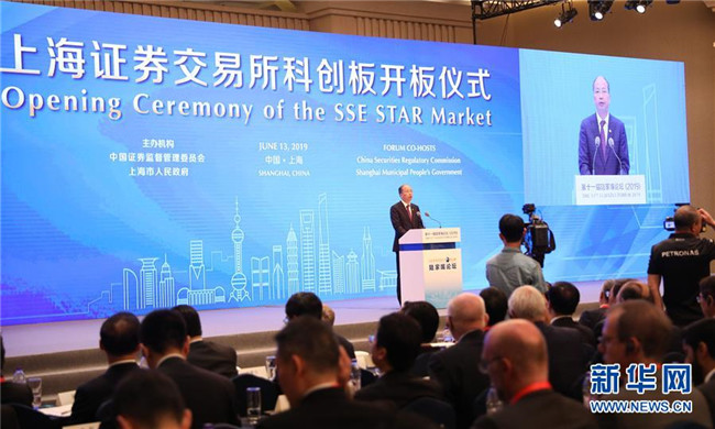 上海證券交易所科創(chuàng)板開板儀式在陸家嘴論壇上舉行。這是中國證監(jiān)會主席易會滿在開板儀式上致辭(6月13日攝)。新華社記者 方喆攝