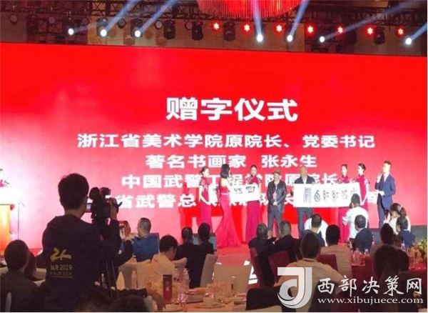 浙江省美術(shù)學(xué)院原院長、黨委書記、著名書畫家——張永生,浙江省武警總隊原總隊長何虎少將現(xiàn)場贈字,西鳳股份公司副董事長、總經(jīng)理賈智勇上臺接受贈字。