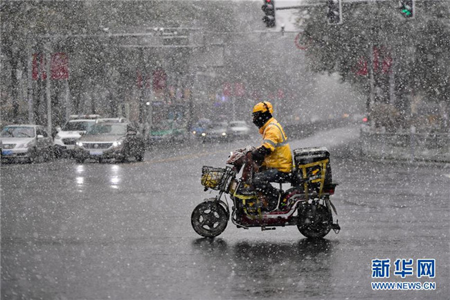 10月31日,在青海省西寧市,一名外賣(mài)配送員在雪中騎行。新華社記者張龍攝