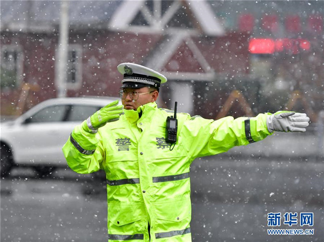 10月31日,在青海省西寧市,交警在雪中指揮車(chē)輛。 新華社記者張龍攝