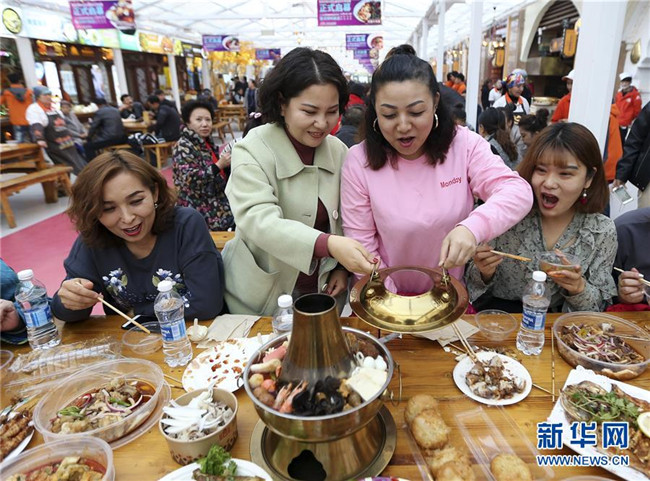 11月2日,游客在大巴扎冰屋美食街品嘗免費(fèi)美食。