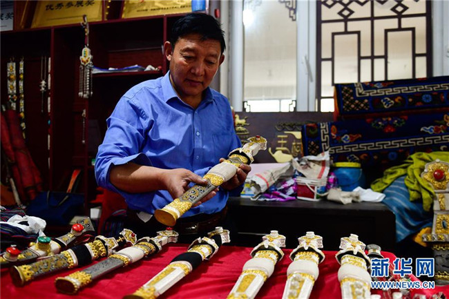 青海省玉樹藏族自治州的芒擦藏刀工藝距今已有上百年歷史。煅制芒擦藏刀需要特殊的材料、具備精湛的技藝,常用到金、銀、紅銅、黃銅、木材、鐵、牛角等材料,煅制工藝復雜。芒擦藏刀樣式精美,受到海內(nèi)外游客歡迎。