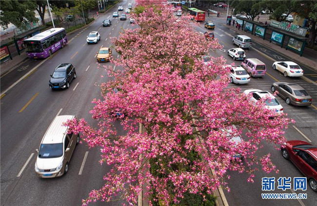 這是美麗異木棉花競相綻放的廣西柳州市東環(huán)大道(12月1日無人機(jī)拍攝)。 新華社記者 黃孝邦 攝