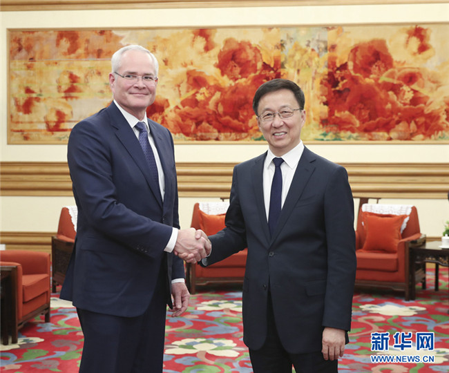 12月3日,中共中央政治局常委、國務院副總理韓正在北京中南海會見美國??松梨诠径麻L兼首席執(zhí)行官伍德倫。 新華社記者 丁海濤 攝