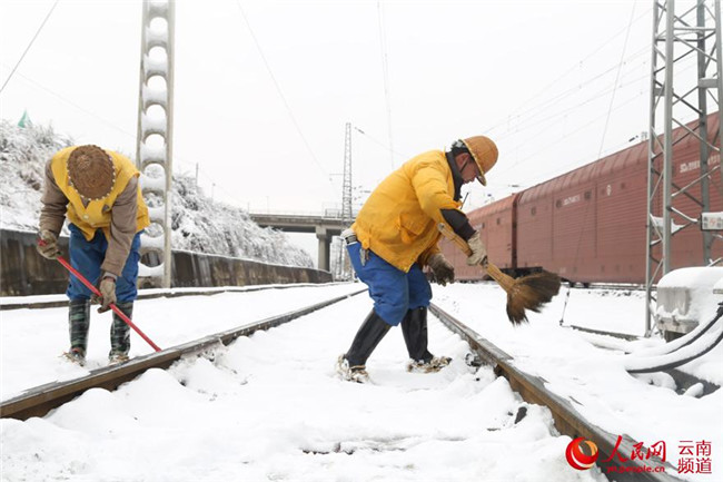 12月5日,云南省滇東北迎來今年以來首場降雪。昆鐵曲靖工務(wù)段及時啟動大雪天氣應(yīng)急預案,成立除雪打冰隊,加強道岔除雪除冰工作。攝影:楊永全
