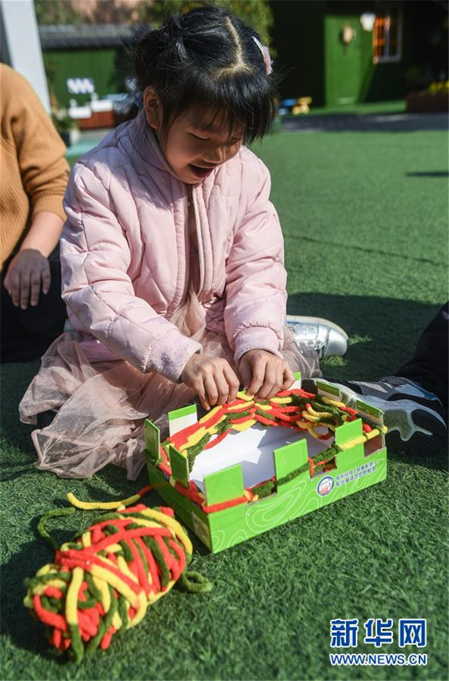 12月11日,小朋友用紙盒制作的工具編織愛心圍巾。 新華社記者 徐昱 攝