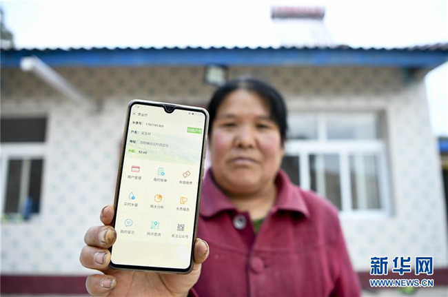 在寧夏固原市彭陽縣白陽鎮(zhèn)白岔村,村民展示可以“手機買水”的界面(10月11日攝)。 新華社記者 馮開華 攝