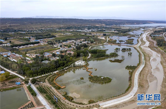 寧夏固原市原州區(qū)境內(nèi)的清水河流域在進(jìn)行防洪加固和人工濕地工程建設(shè)(10月10日無人機拍攝)。 新華社記者 馮開華 攝