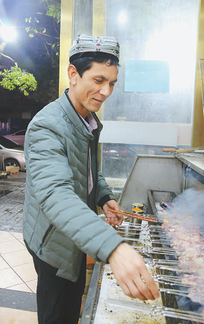 曾在阿布拉江烤肉王餐廳做過服務(wù)員的如則托合提夫婦,去年從和田老家來到南昌,經(jīng)過一年多學(xué)習(xí),今年5月選擇“單飛”,開了一家屬于自己的燒烤店。“租門面、搞裝修,都是阿卜杜拉一手幫我弄的,還提供了兩萬元啟動資金。”談起眼下的生活,如則托合提非常滿意。