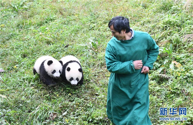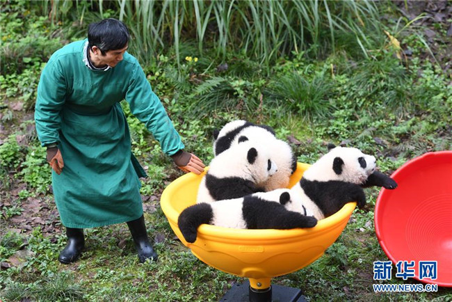 12月22日,飼養(yǎng)員引導(dǎo)大熊貓寶寶到戶外運(yùn)動。當(dāng)日,重慶動物園為4只大熊貓寶寶“雙雙”“重重”“喜喜”“慶慶”舉行半歲生日慶?;顒?。4只半歲大熊貓?jiān)陲曫B(yǎng)員的照料下,在熊貓館運(yùn)動場內(nèi)玩耍、嬉戲,與市民游客一同過冬至。新華社記者唐奕攝