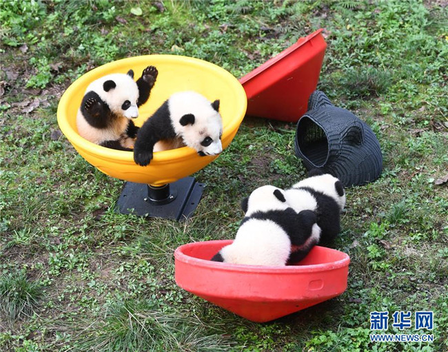 12月22日,重慶動物園4只半歲大熊貓?jiān)趹敉饣顒?。?dāng)日,重慶動物園為4只大熊貓寶寶“雙雙”“重重”“喜喜”“慶慶”舉行半歲生日慶祝活動。4只半歲大熊貓?jiān)陲曫B(yǎng)員的照料下,在熊貓館運(yùn)動場內(nèi)玩耍、嬉戲,與市民游客一同過冬至。新華社記者唐奕攝