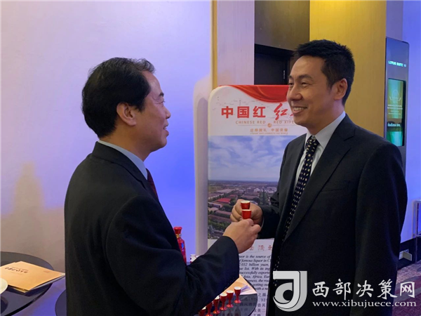陜西西鳳酒營銷管理公司海外市場負(fù)責(zé)人閆紅斌代表企業(yè)向泰國國務(wù)院前副總理、泰中友好協(xié)會(huì)會(huì)長功·塔帕郎西贈(zèng)送紅西鳳酒